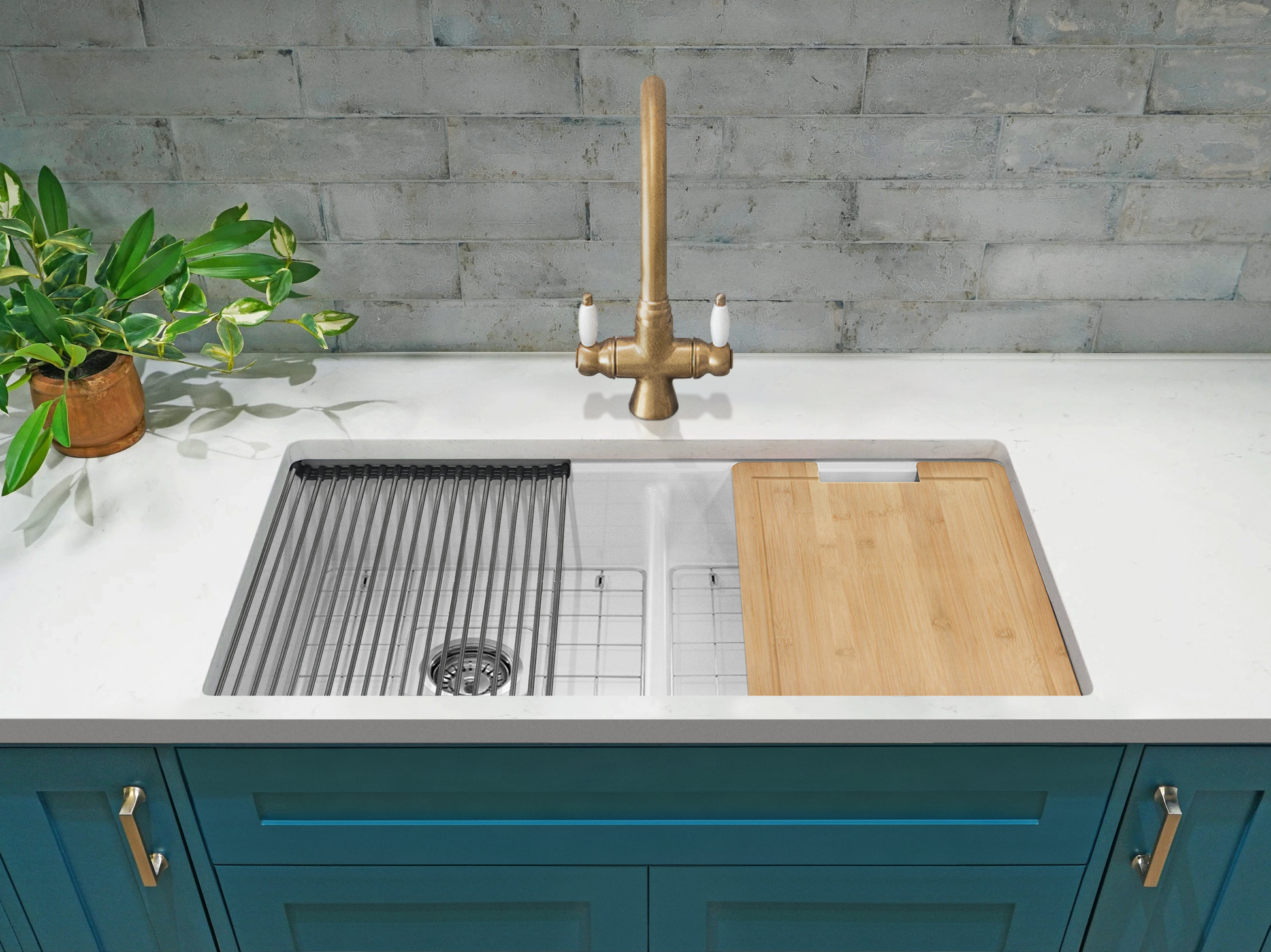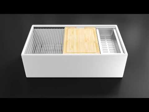 Undercounter Fireclay Double Bowl Workstation Sink with Chopping Board, Grid, Grill, Colander & Waste - 840mm